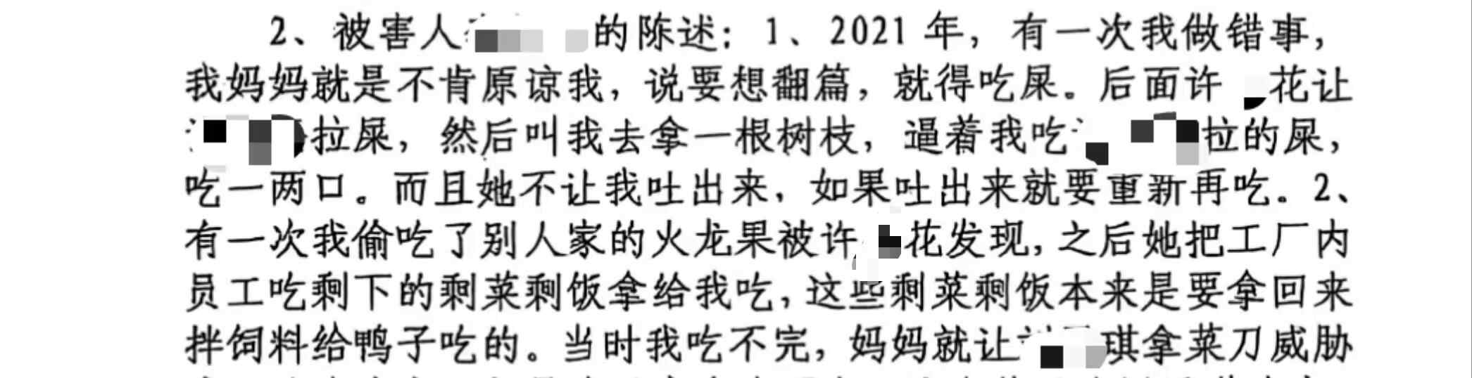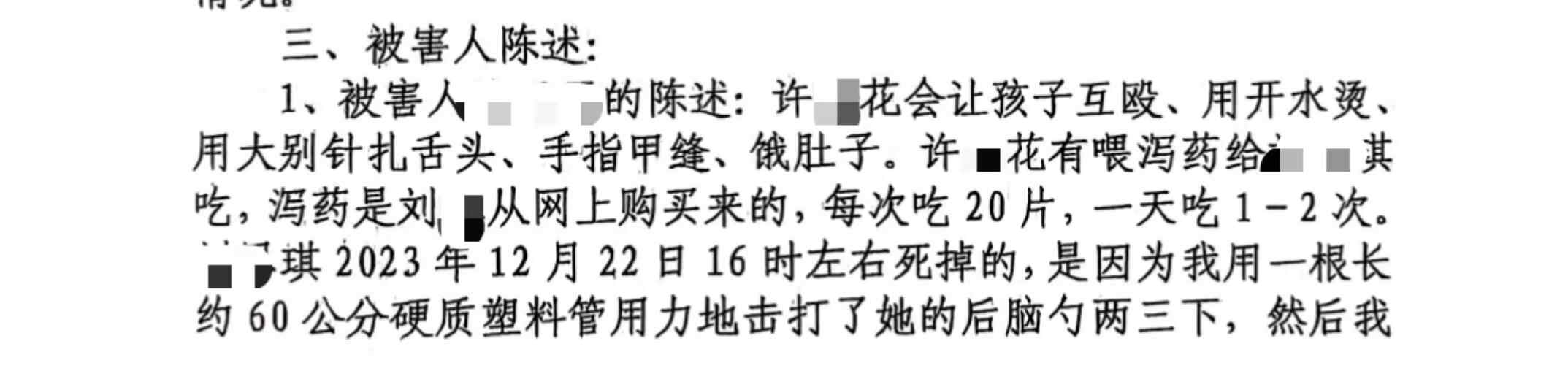 有小孩称许某花会让孩子互殴、用开水烫、饿肚子等。还有小孩称,自己在2021年做错事时,许某花不肯翻篇,一定要自己去吃其他小孩的排泄物。在他们被要求打琪琪时,琪琪都是喊“妈妈不要打了,妈妈不要打了”,如果他们不愿意,也会被打或者冷暴力。