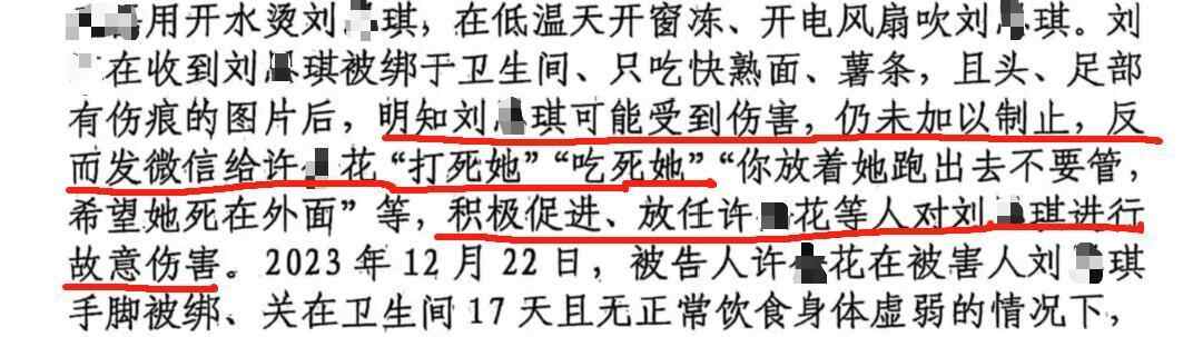 期间刘某明知琪琪可能收到伤害,仍未加以制止,反而发消息给许某花“打死她”“吃死她”“你放着她跑出去不要管,希望她死在外面”等,积极促进、放任许某花等人的行为。