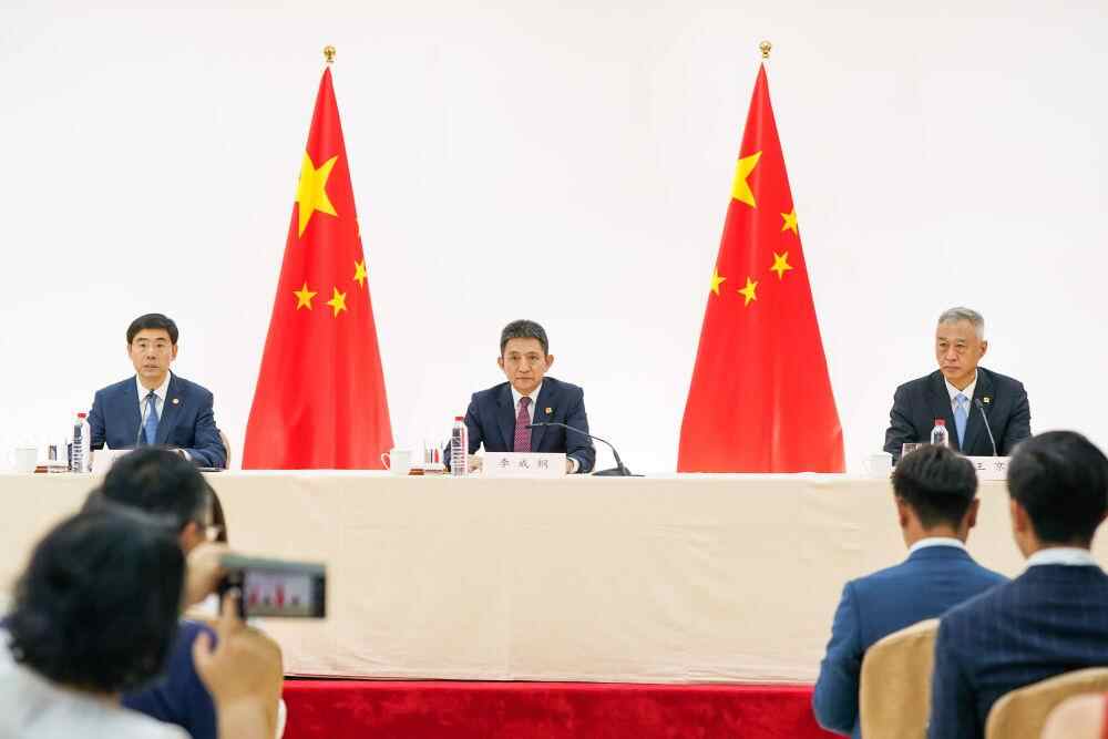 当地时间9月15日,中美经贸会谈中方新闻发布会在西班牙马德里举行。中国商务部国际贸易谈判代表兼副部长李成钢、国家互联网信息办公室副主任王京涛出席发布会。商务部新闻发言人何亚东主持发布会。新华社记者 彭子洋 摄