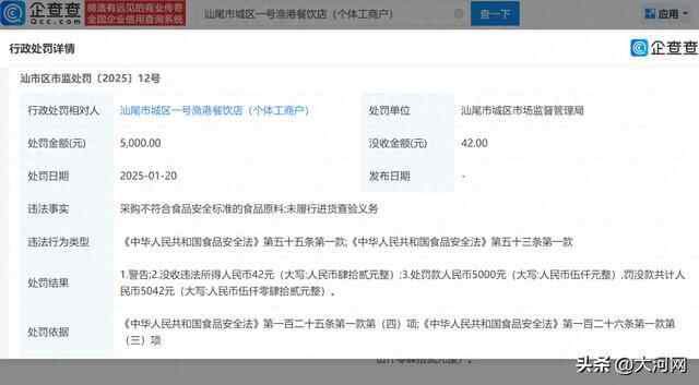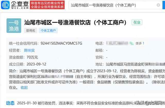 企查查APP显示,涉事的汕尾市城区一号渔港餐饮店(个体工商户)成立于2023年9月,经营者为陈某实,资金数额为70万元,经营范围包含餐饮服务、食品销售。今年1月,该公司因采购不符合食品安全标准的食品原料、未履行进货查验义务被汕尾市城区市场监督管理局罚没5042元。第三方平台显示,该餐厅目前已暂停营业。