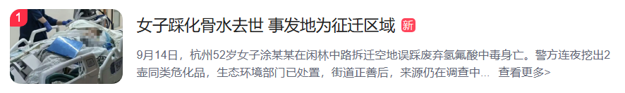 据闲林街道办事处通报称,2025年9月9日,涂某某(女,52岁)在进入闲林中路附近空地时,不慎接触废弃氢氟酸中毒,送医后经抢救无效于2025年9月14日凌晨不幸身亡。公安机关在接警后第一时间介入调查;生态环境部门已按规范完成现场无害化处置;街道正在全力推进善后处置工作。目前,事发原因正在进一步调查中。