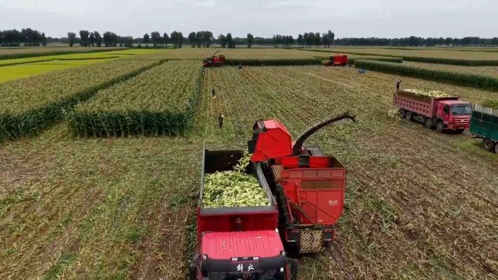 新疆巴音郭楞蒙古自治州焉耆县的1.5万亩青贮玉米迎来丰收。在永宁镇九号渠村,大型青贮收割加工机将一株株玉米从根部割断,粉碎后抛入集草车。