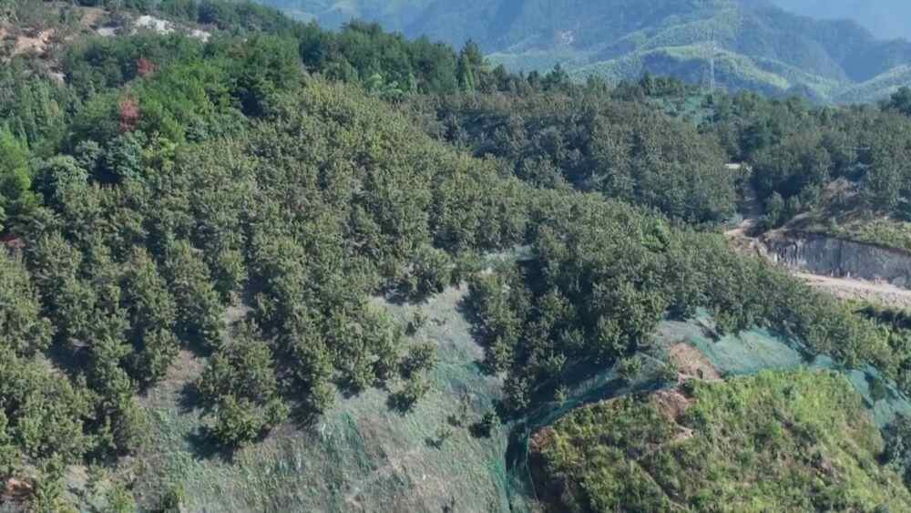 近年来,临安区大力推广张网采收,在昌化镇白牛村西谷坪经济林林场,一张张绿色的网像地毯一样铺满山头。