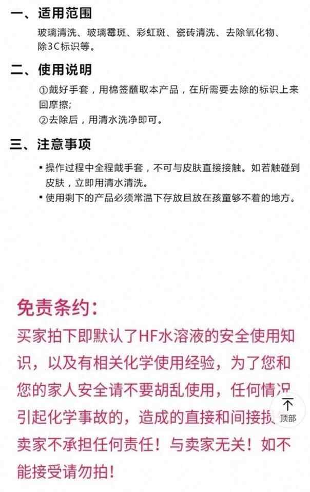 而在商品页面上,不少商家提及其功能,写有“清洗玻璃霉斑、彩虹斑、去除玻璃3C标志性、图案、蚀刻玻璃,瓷器陶瓷、石头作旧、酸洗金属,去除表面氧化物”等宣传语,但在页面内介绍产品时却仅说明“戴好手套、棉签蘸取;不可与皮肤直接接触,如若接触到皮肤,立即用清水清洗。”但并未提及要在通风、戴安全面罩的情况下使用,也并未提及剩余试剂的保存问题 ;同时注明免责条约“买家拍下即默认使用常识和化学使用经验”等内容。