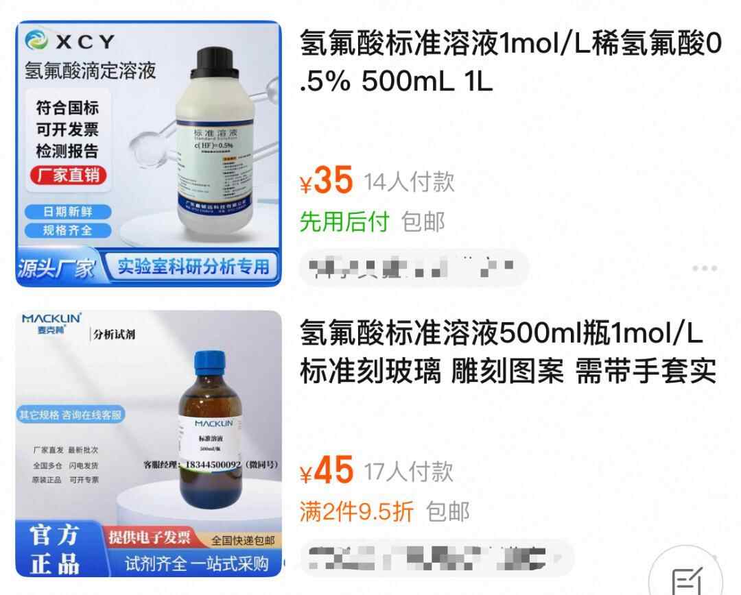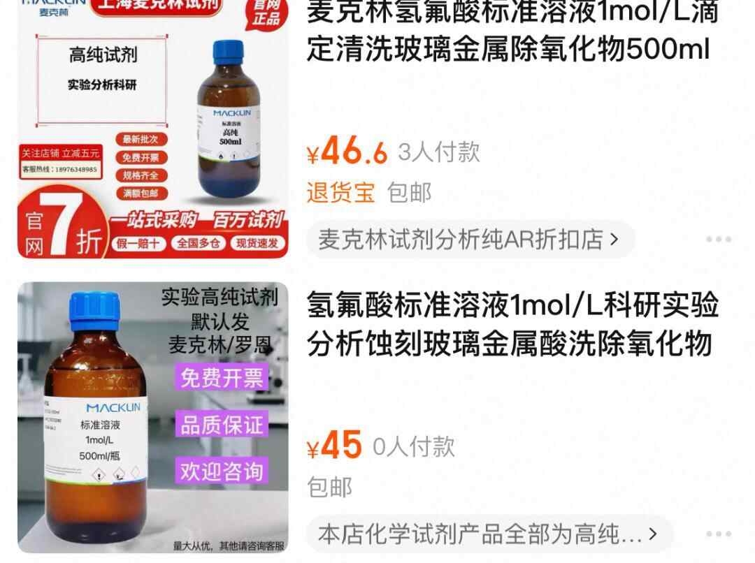 9月16日,记者在网购平台上搜索“氢氟酸溶液”“HF水溶液”“氢氟酸清洗剂”等,页面上却可直接跳转出多家在售的标准溶液 。