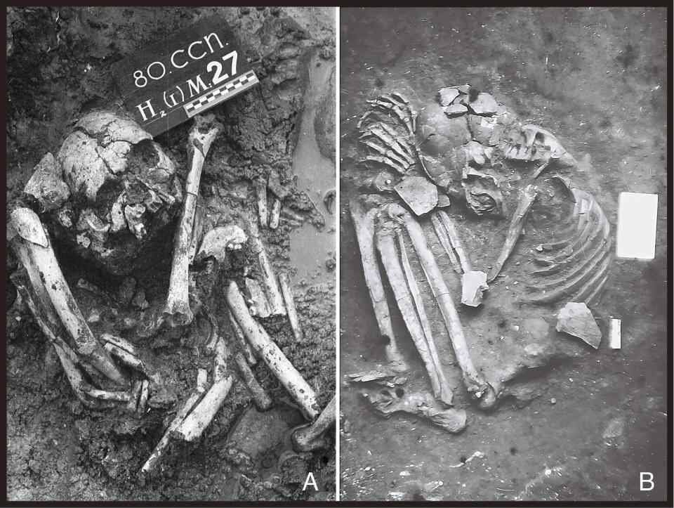 研究人员在中国和越南的多个考古遗址发现了以蜷缩或蹲坐姿势埋葬的人类遗骸,这些遗骸上有一些切割和烧灼痕迹,此外,在菲律宾、老挝、泰国、马来西亚和印度尼西亚也有少量发现。