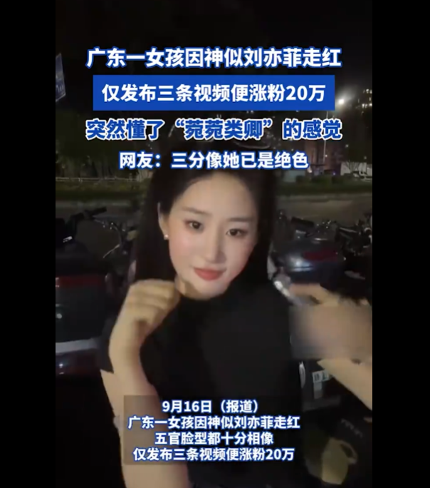 9月16日(报道)。广东一女孩因神似刘亦菲走红,五官脸型都十分相像,仅发布三条视频便涨粉20万。