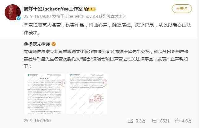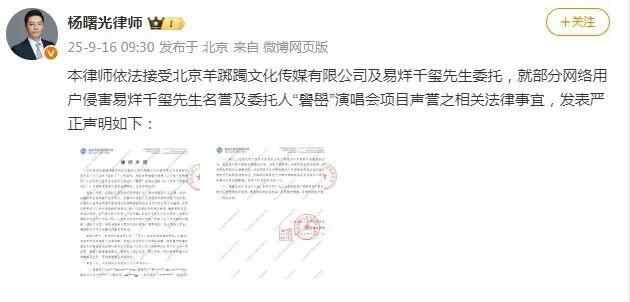 9月16日,易烊千玺方@杨曙光律师 发布律师声明:本律师依法接受北京羊踯躅文化传媒有限公司及易烊千玺先生委托,就部分网络用户侵害易烊千玺先生名誉及委托人“礐嶨”(què xué)演唱会项目声誉之相关法律事宜,发表严正声明。