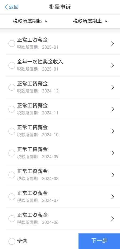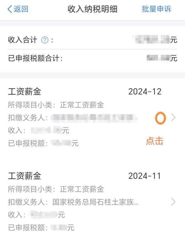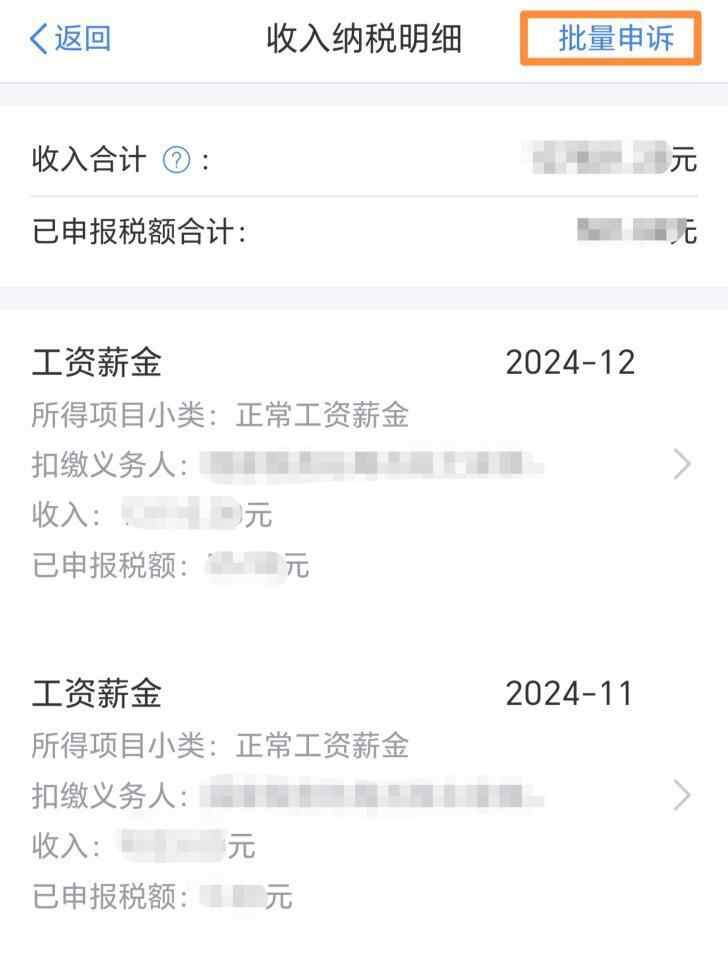 如果发现“被收入”的情况较多,可以在个人所得税APP【首页】→【收入纳税明细查询】选择纳税录年度、所得类型,点击【批量申诉】,确定申诉单位后,勾选有问题的收入项目进行批量申诉。