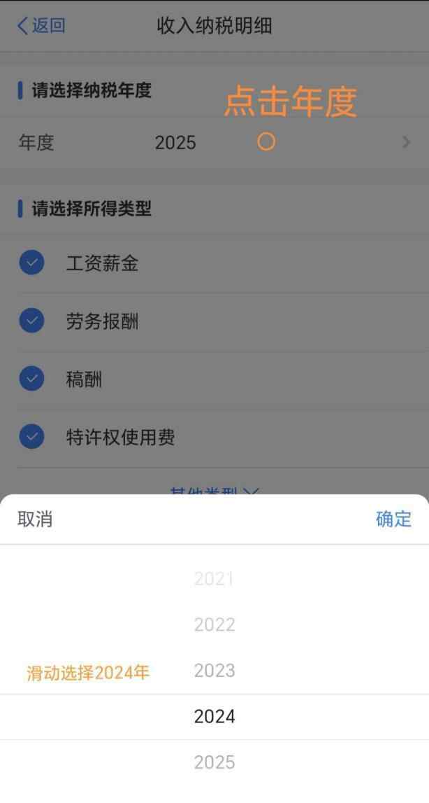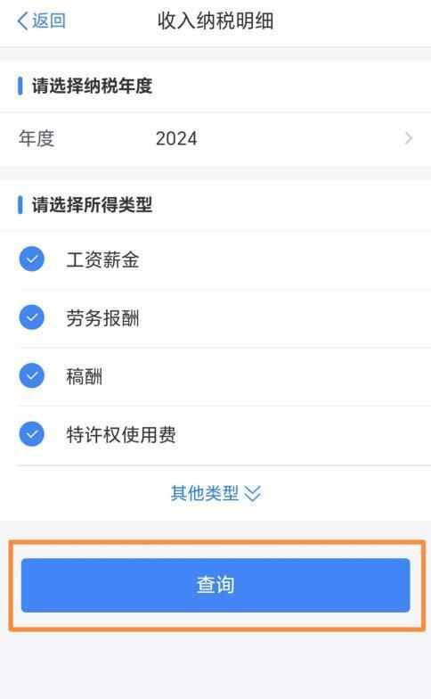 登录个人所得税APP→【首页】→【收入纳税明细查询】选择纳税录年度、所得类型。