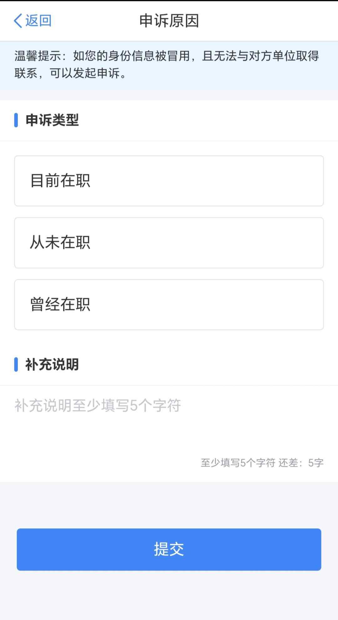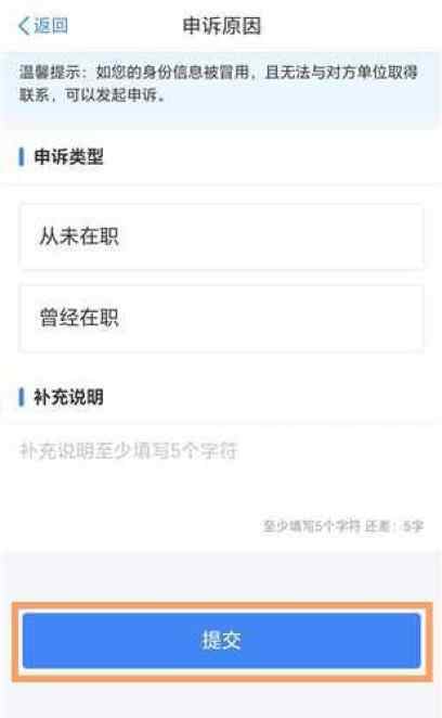 认真阅读【申诉须知】后,不属于图上三项情形中任何一项的,可继续点击【开始申诉】进入详情页面,申诉类型选择【从未在职】,完善【补充说明】后提交即可。