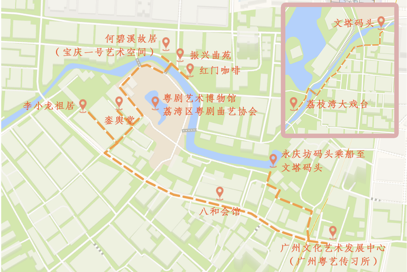 李小龙祖居-銮舆堂-粤剧艺术博物馆-荔湾区粤剧曲艺协会-何碧溪故居(宝庆一号艺术空间)-红门咖啡-振兴曲苑-广东八和会馆-广州文化艺术发展中心(广州粤艺传习所)-荔枝湾大戏台