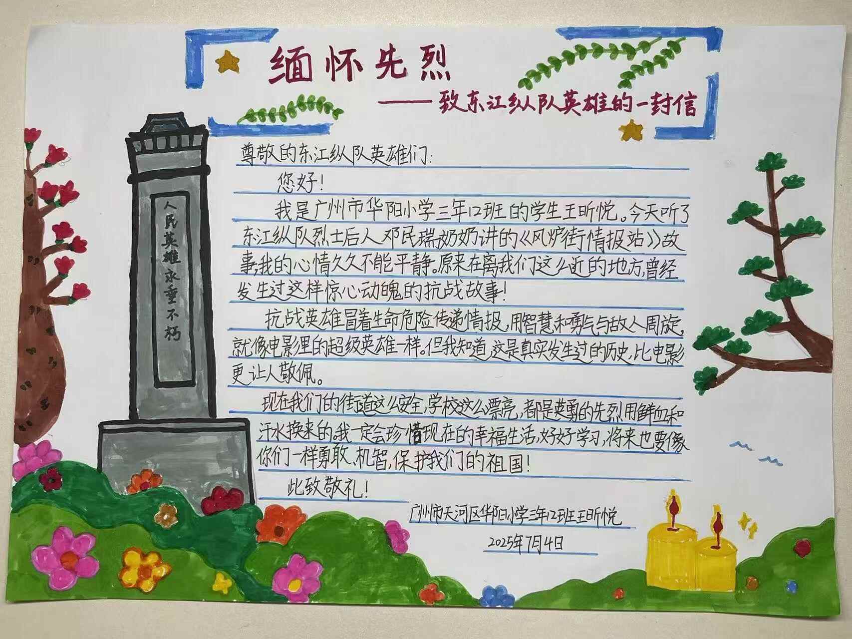 “听了东江纵队烈士后人邓民瑞奶奶讲述的《风炉街情报站》的故事,我才知道,原来在离我们这么近的地方发生过这样惊心动魄的抗战故事!”广州市天河区华阳小学三年级12班的王昕悦对抗战英烈的勇气充满钦佩,并动情地写下“好好学习、保卫祖国”的感言。