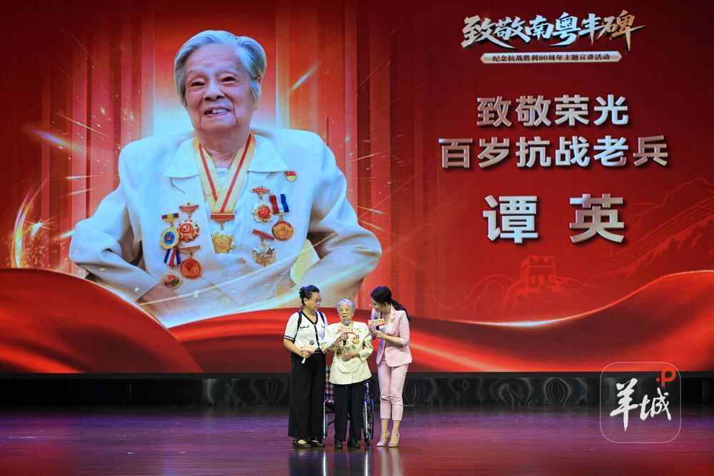 当天,最动人的当属百岁抗战老兵谭英登台接受致敬的环节。18岁时,因目睹日军在中山的暴行,谭英决定加入中山人民抗日义勇大队。战火纷飞中,她投身伤员救治与抗日宣传工作,并积极为前线游击队筹措经费物资。
