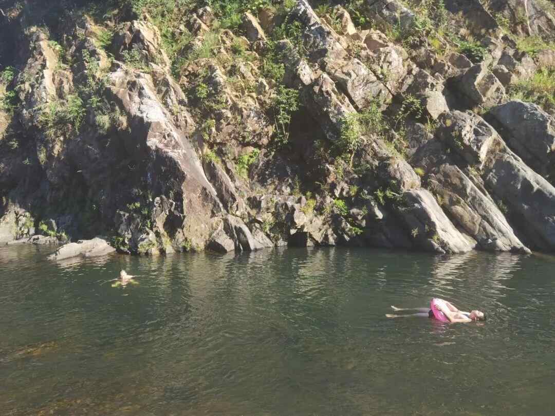 林洪浩比我们晚到大概半个钟,期间他打过几次电话来,说路越走越窄,是不是导航错了。我说你就放心走吧。林洪浩一到,我赶紧让他下水。此时颜长江、邓勃、陈衡运和我已经在深潭里游了半个钟。天气真热,太阳真大,必须畅游,这是翁山当代艺术馆最独特的待客之道。今天水要浑浊一些,因为水流量较大,带来些细沙。用了陈恒运的游泳镜,于是看到了下面游动的小鱼,自由自在。