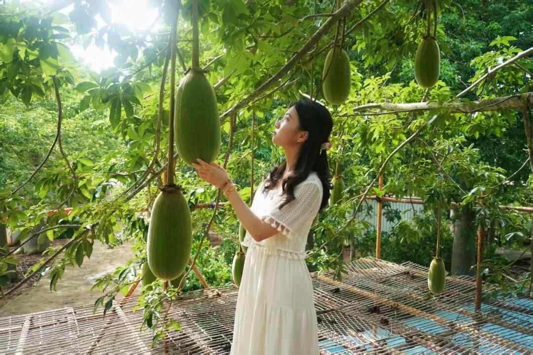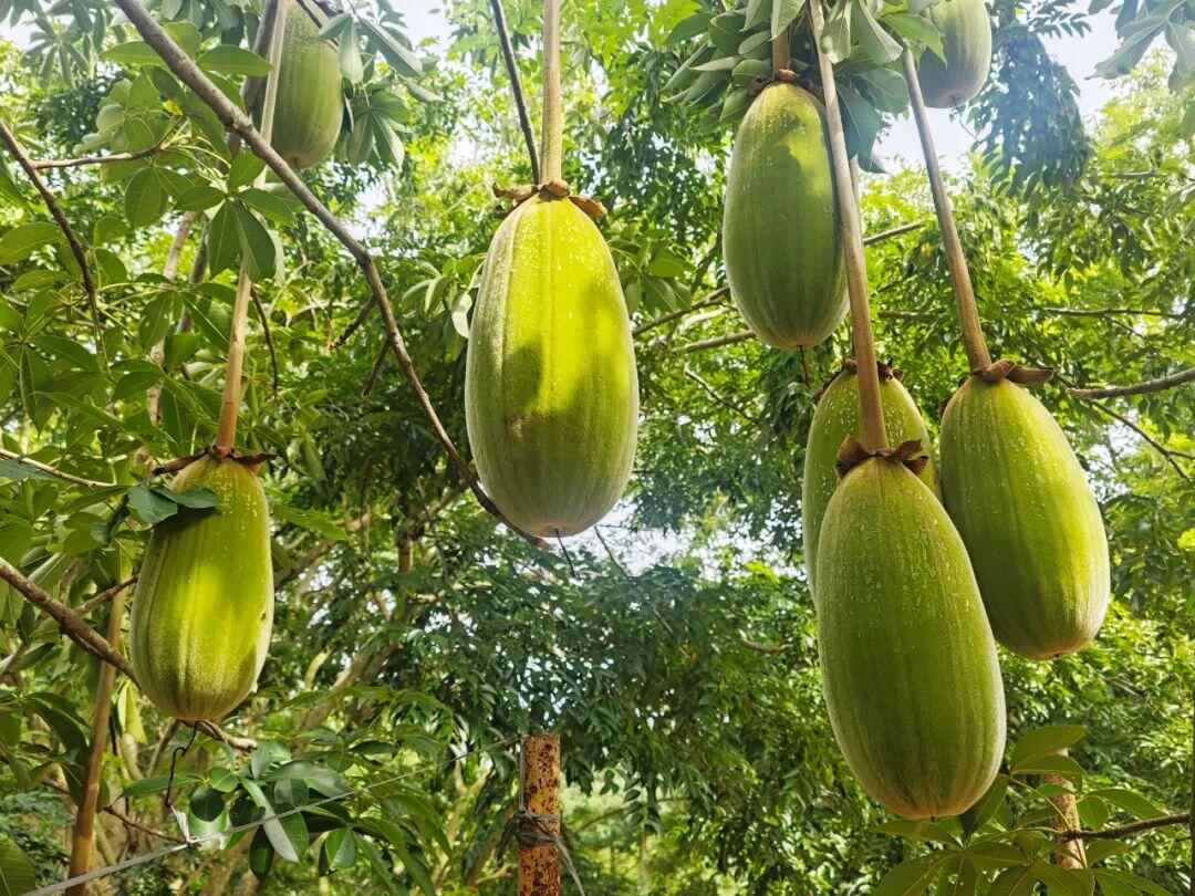 走进湛江市麻章区花村的猴面包树林,只见一棵树上悬挂着两百多个果实,每个重达十几斤,硕果累累如绿炮弹。