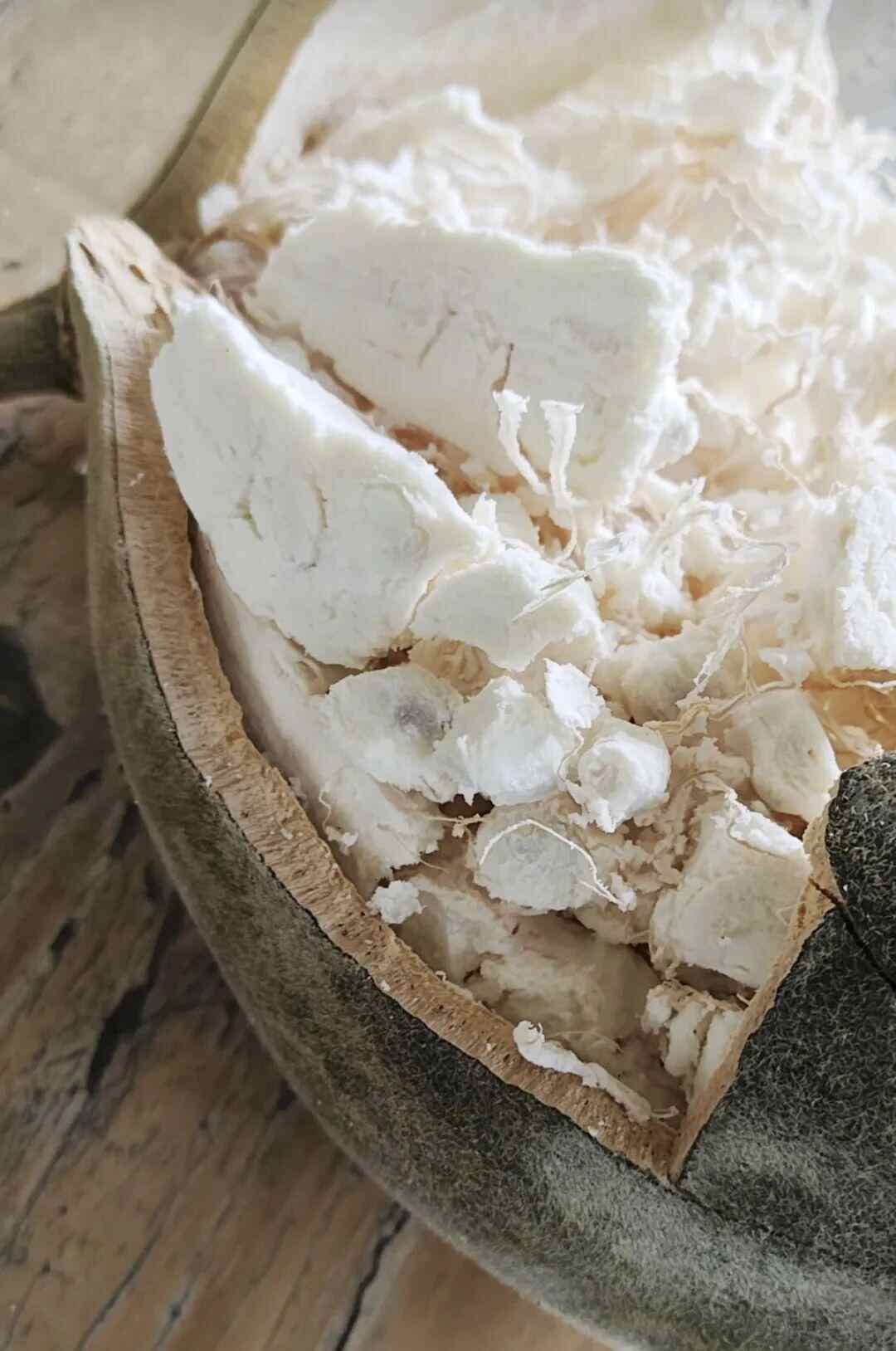 用力将其剖开,果肉是干燥的、粉质的,呈现出淡淡的乳白色或浅黄色,可作为面粉使用,既可生吃,又可制作饮料和调味品,有种清爽的酸味。