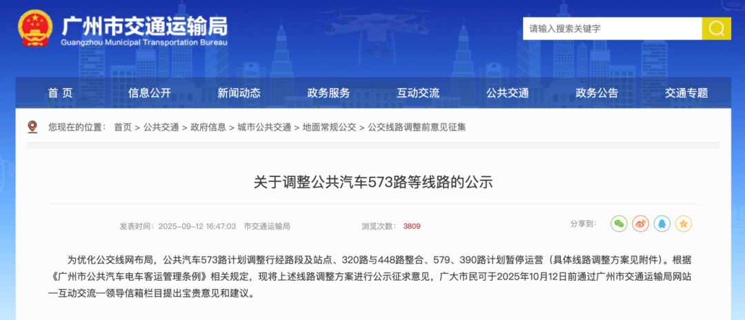 根据《广州市公共汽车电车客运管理条例》相关规定,现将上述线路调整方案进行公示征求意见,广大市民可于2025年10月12日前通过广州市交通运输局网站—互动交流—领导信箱栏目提出宝贵意见和建议。