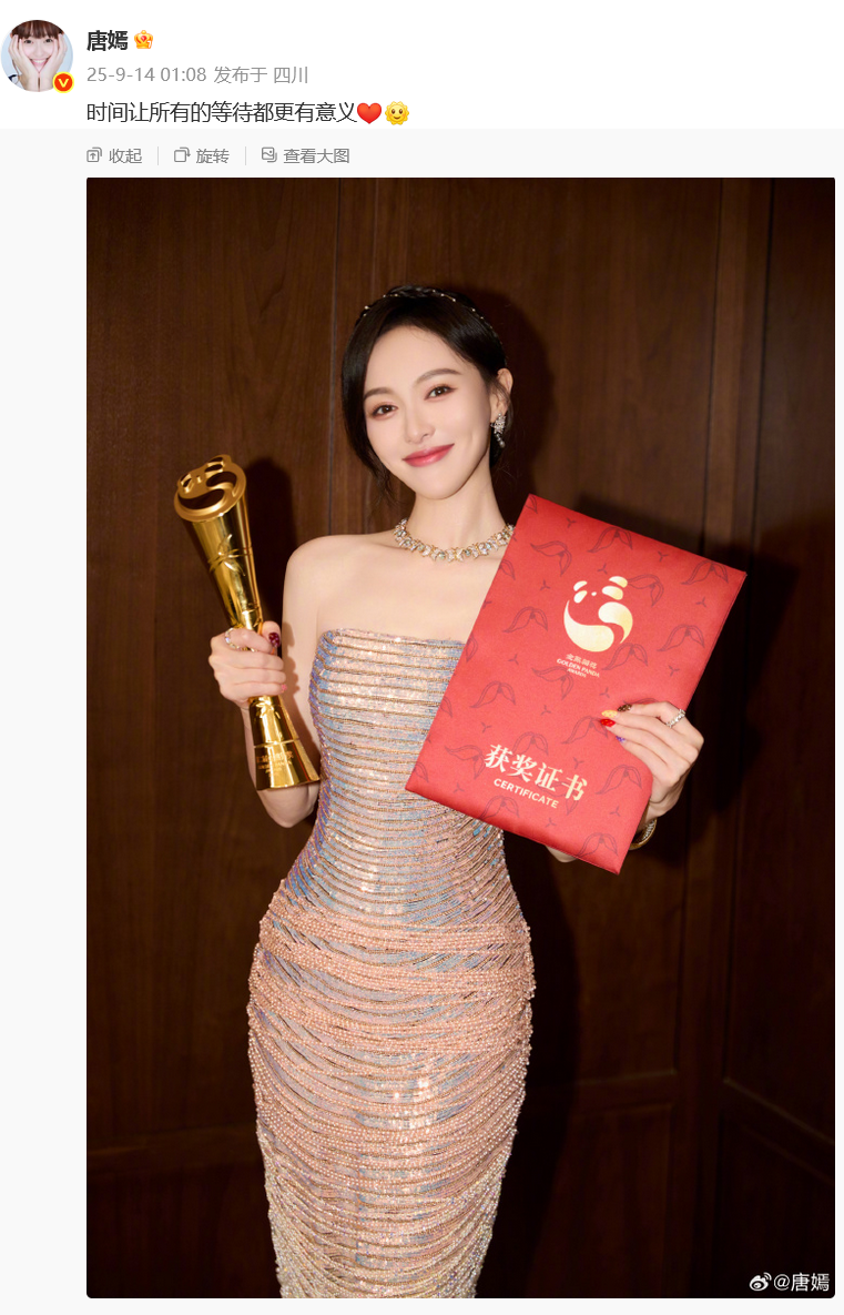 9月14日凌晨,唐嫣晒举奖杯照回应:“时间让所有的等待都更有意义。”