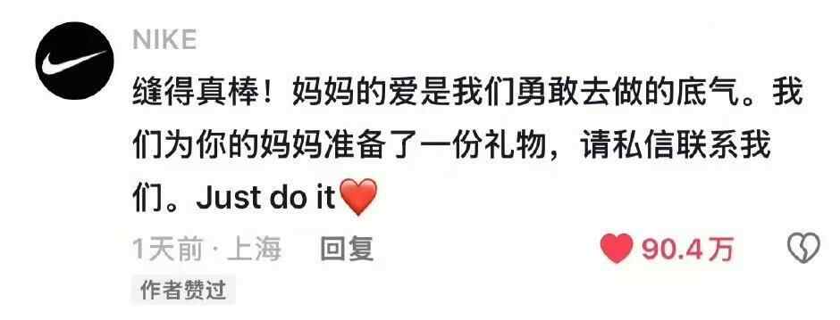 在评论区,耐克体育(中国)有限公司官方账号“NIKE”留言称为妈妈准备了一份礼物,引发众多网友的猜测与热议,不过目前该条评论已被删除。
