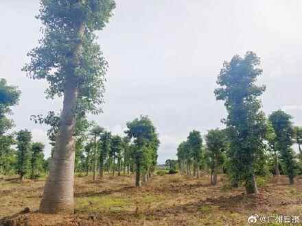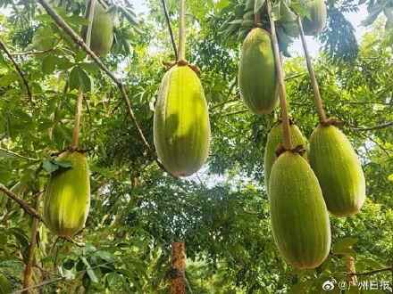 18年前,广东湛江一合作社负责人林荣振从马达加斯加引进猴面包树,而后在湛江的麻章区种植了约1000亩猴面包树。一般猴面包树要生长20年以上才会结果,目前,麻章树林里有两棵树达到了结果要求,其他的后续也会陆续结果。除了湛江,林荣振还在广东其他地市(比如河源等地)试种猴面包树。多年实践表明,湛江的气候与土壤条件最适宜该树种生长,果实大小甚至优于非洲原产地。走进麻章区花村的猴面包树林,只见一棵树上悬挂着两百多个果实,每个重达十几斤,硕果累累如绿炮弹!
