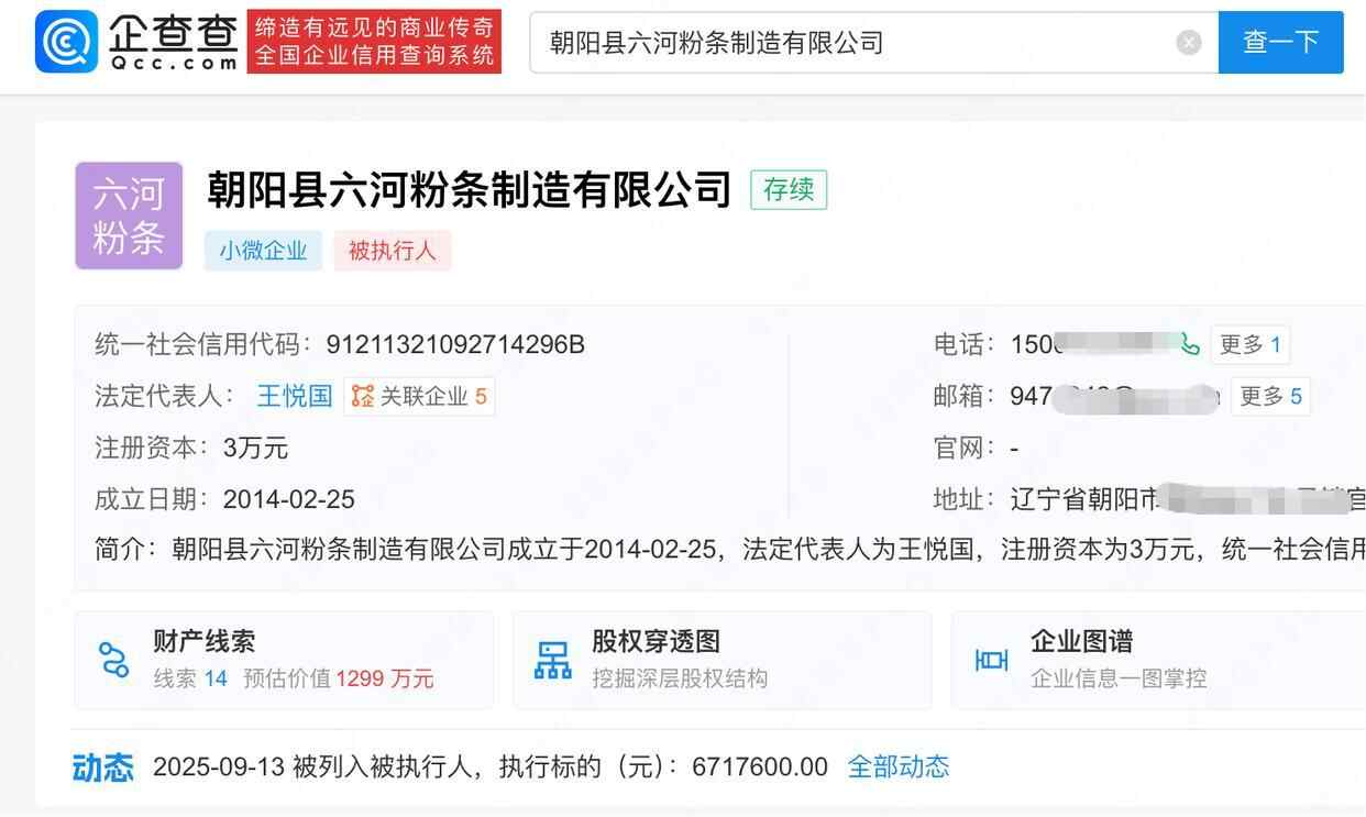 企查查APP显示,近日,朝阳县六河粉条制造有限公司新增一则被执行信息,执行标的671.76万余元,执行法院为辽宁省朝阳市朝阳县人民法院。信息显示,该公司成立于2014年2月,法定代表人为王悦国,注册资本3万元。