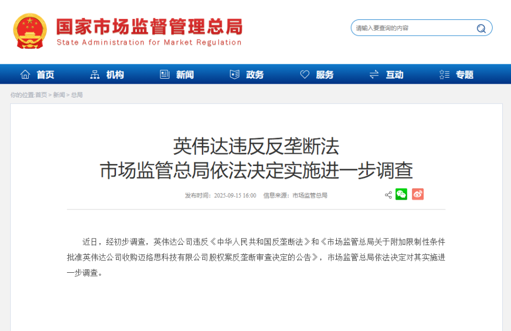 近日,经初步调查,英伟达公司违反《中华人民共和国反垄断法》和《市场监管总局关于附加限制性条件批准英伟达公司收购迈络思科技有限公司股权案反垄断审查决定的公告》,市场监管总局依法决定对其实施进一步调查。