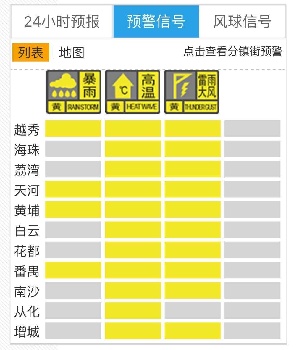 截至15日17时,越秀、天河、黄埔、番禺等区,同时发布暴雨黄色、雷雨大风黄色预警信号;海珠、荔湾、白云、花都、南沙、增城,发布雷雨大风黄色预警信号。广州各区维持发布高温黄色预警信号。
