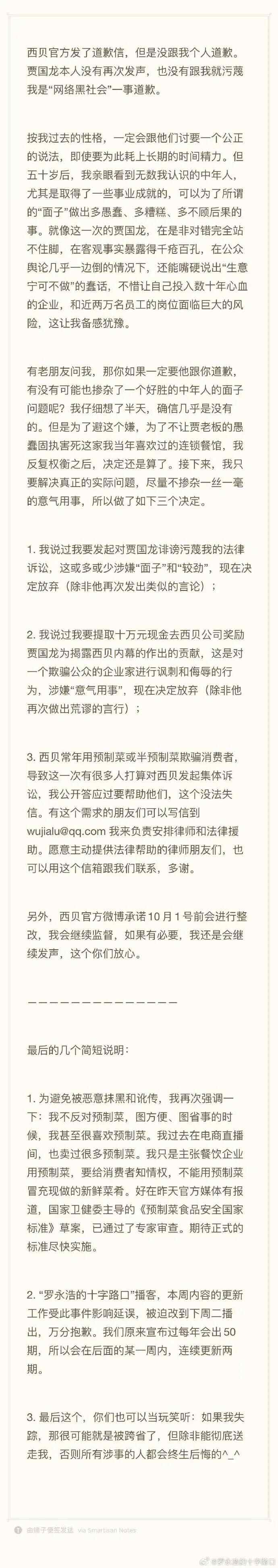 9月15日,罗永浩发文称,决定放弃进一步追究西贝。全文如下: