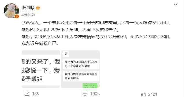 9月15日,女星张予曦发文称自己被跟踪:共两伙人,一个来我及我另外一个房子的租户家里,另外一伙人跟踪我几个月。跟踪的今天我已经拍下了车牌,再有下次就报警了。 跟踪,给我的家人及工作人员发短信辱骂没什么光彩的,我也不会因此怕你们。我永远会做我自己。