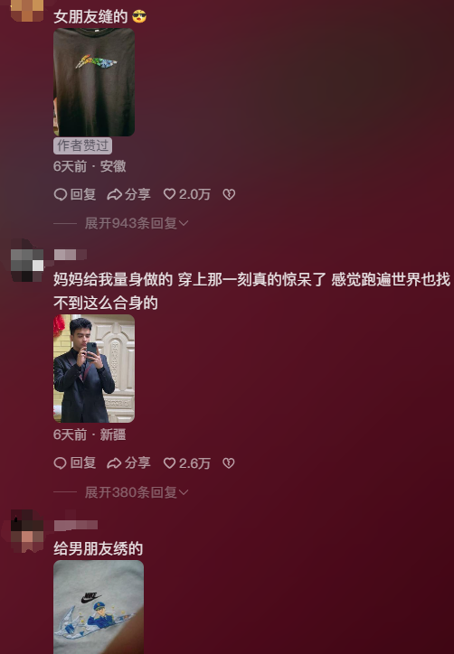 在评论区,不少网友晒出了家人为自己亲手缝制的手工艺品,“评论我都会看,其实不止是父母,还有很多是男女朋友之间,看到这些评论也会很感动,会觉得人间还是有爱存在的。”