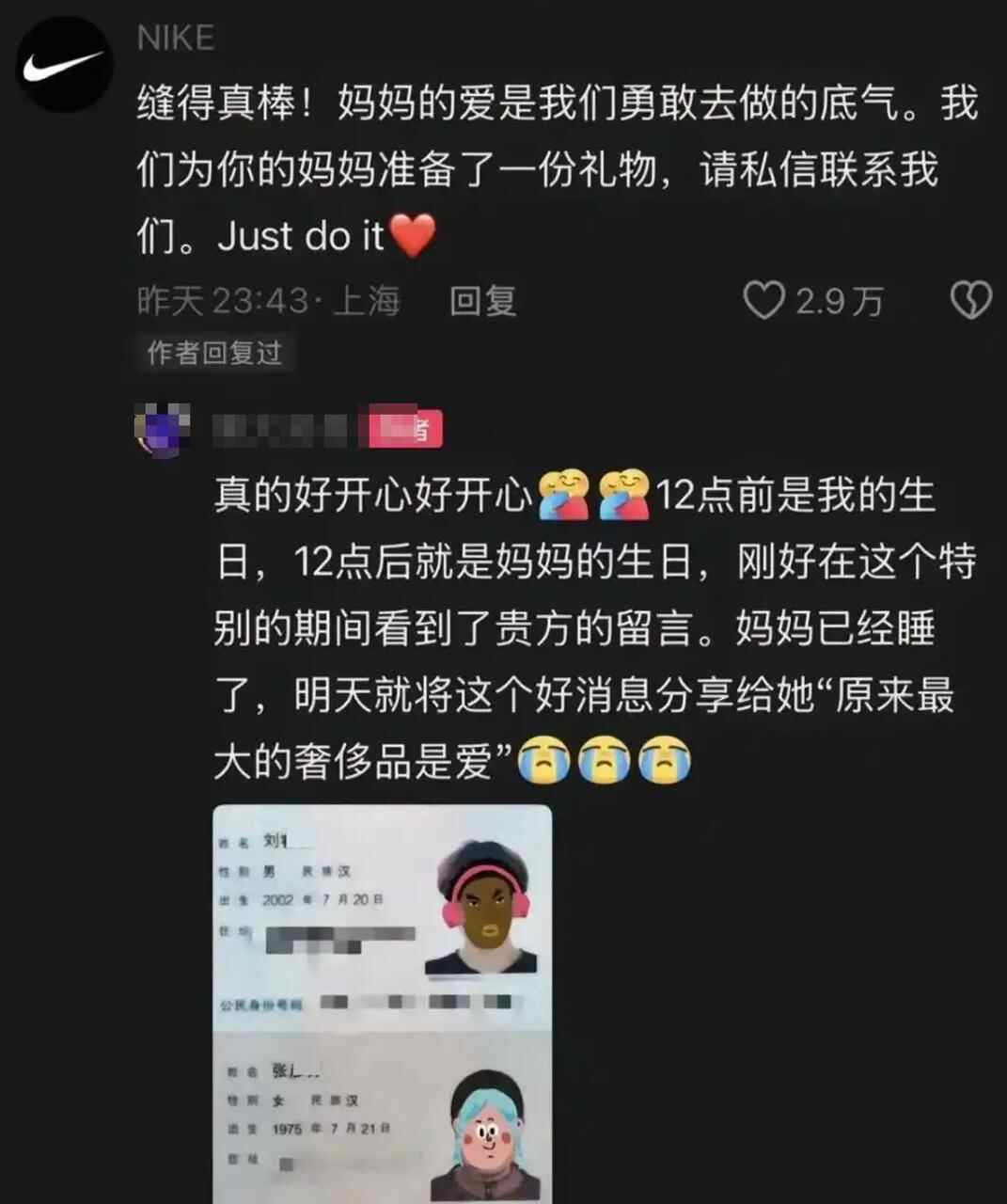 视频发出后,9月11日晚上11时许,刘先生在评论区看到Nike官方的评论,“当天正好是我生日,我和妈妈的生日差一点,过了0点就是妈妈的生日。那几天爸爸正好从甘肃来到陕西陪我过生日,看到评论的时候我特别激动,我爸都已经睡着了,我又把他叫醒和他分享这个事。”