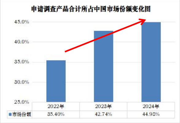 证据显示,2022年以来,申请调查产品合计所占中国市场份额持续上升。2022年至2024年,申请调查产品合计所占中国市场份额分别为35.40%、42.74%和44.98%,2023年、2024年与上年相比分别上升7.34个百分点和2.23个百分点,2024年比2022年累计上升9.57个百分点,年均份额高达41%。申请调查产品在中国市场上占据主导地位,是中国相关模拟芯片市场的价格标杆,主导和决定着中国相关模拟芯片价格的走势。