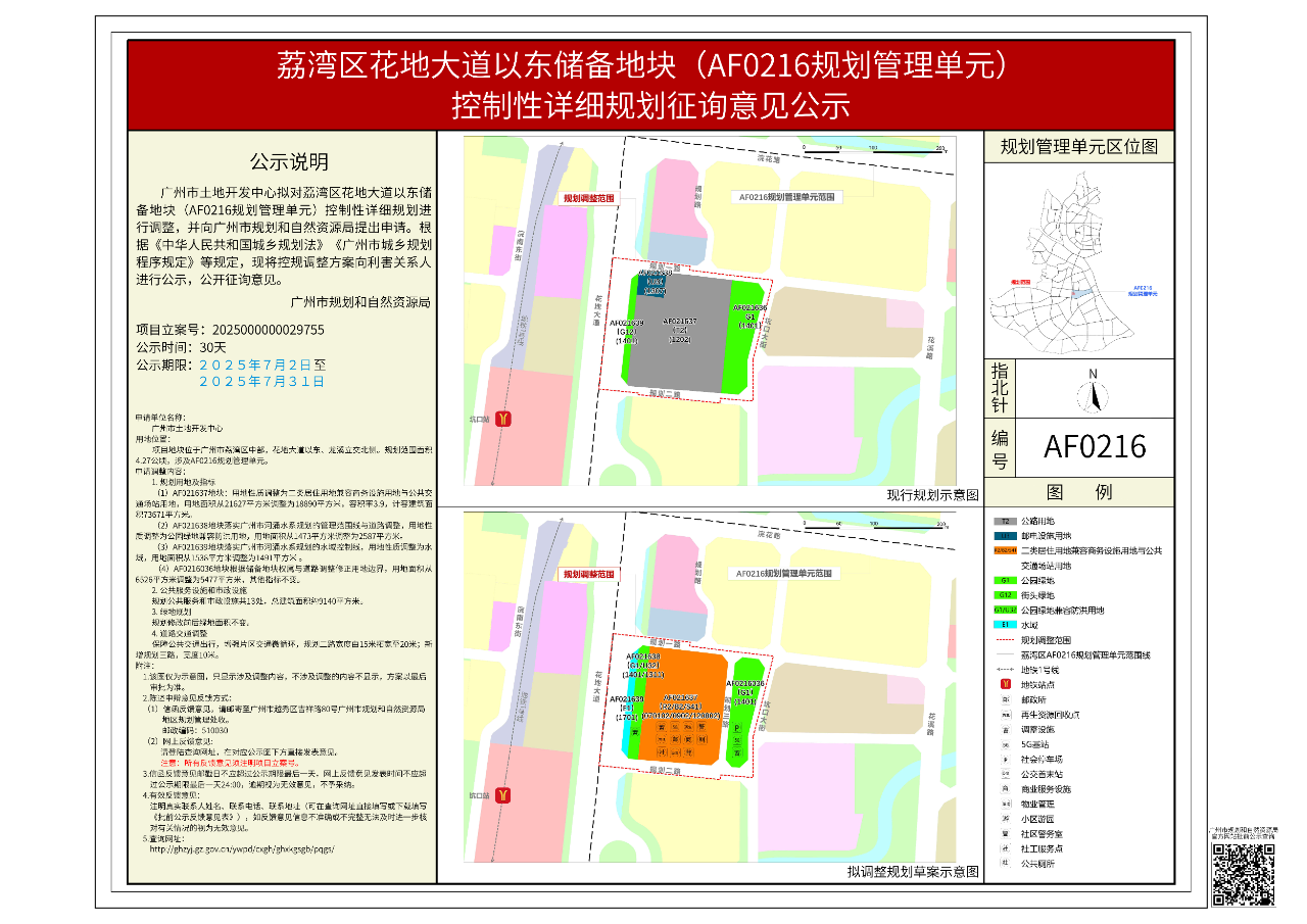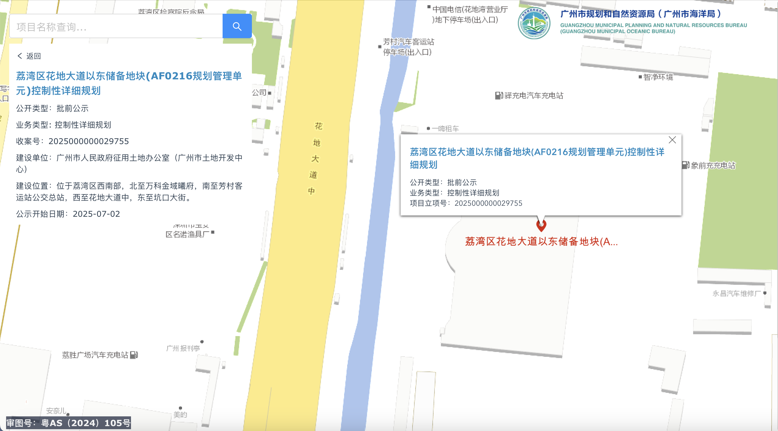 2025年7月28日,第四届广州市规划委员会地区规划专业委员会第二十八次会议审议通过《荔湾区花地大道以东储备地块(AF0216 规划管理单元)控制性详细规划》方案。芳村客运站地块从公路用地(T2)调整为二类居住用地兼容商务设施用地与公共交通场站用地(R2/B2/S41)。