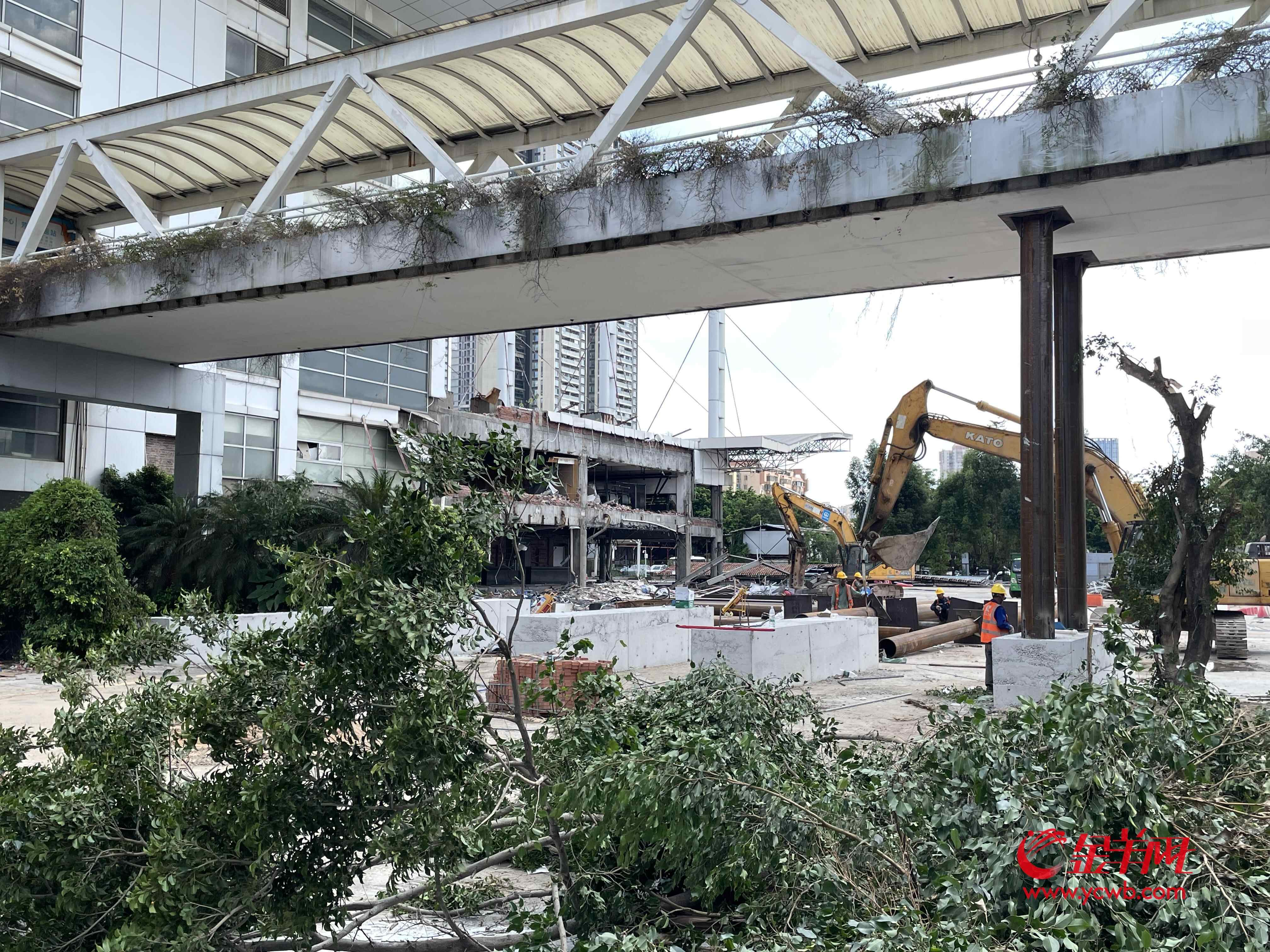 记者从坑口地铁站B出口,经荔胜广百广场,步行天桥到芳村客运站。连通芳村客运站站厅大楼的天桥入口处已被封闭。从天桥处俯视,可以看到站厅大楼周围已被隔板围蔽,部分区域有被施工拆除的痕迹。在走访期间,记者看到有工人在施工作业。