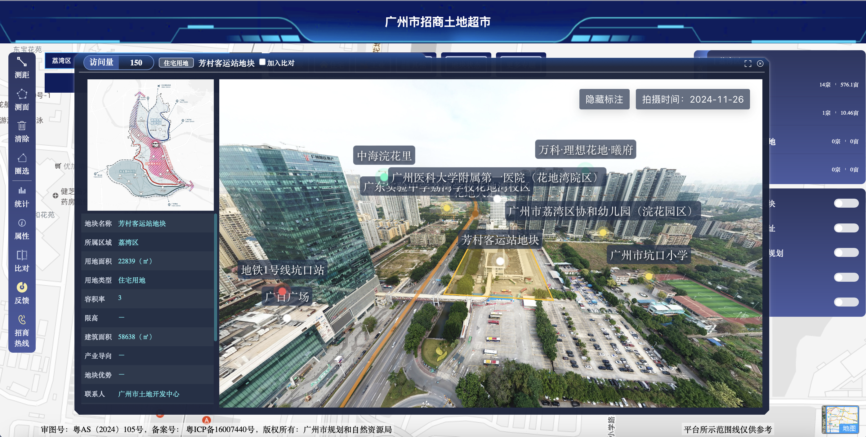 记者在广州市招商土地超市发现,芳村客运站地块的用地类型已标注为住宅用地,用地面积为22839平方米。从地图可见,周边有医院、地铁站、商场、学校等设施。