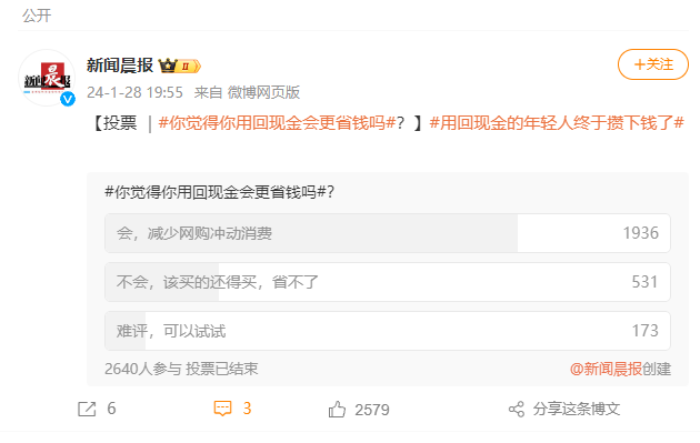 有媒体在社交平台上也设置了投票来探寻年轻人对于“使用现金是否更容易攒下钱”的态度,结果显示,大多数人选择了“会,减少网购冲动消费”这一项。
