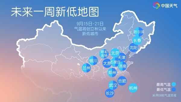 最低气温创新低多在17日至20日,东北地区中北部、华北北部以及西北地区不少地方气温将降至个位数,内蒙古东北部、黑龙江西北部一带或降至0℃以下