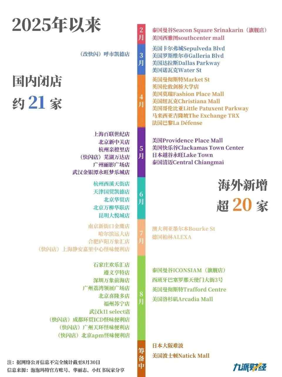 2024年末大陆地区门店数量为401家,据记者不完全统计,2025年以来截至8月30日,已知关停21家门店(其中1家改为快闪)、5家POP UP快闪店,另有多家门店暂时停业换新,从商场负一楼晋升到一楼店铺,从原本铺位调整到纪梵希等品牌隔壁。与此同时,海外新增超20家门店,国内“预计净增长十家门店内”也多数为S级门店、城市旗舰店等大店店态。