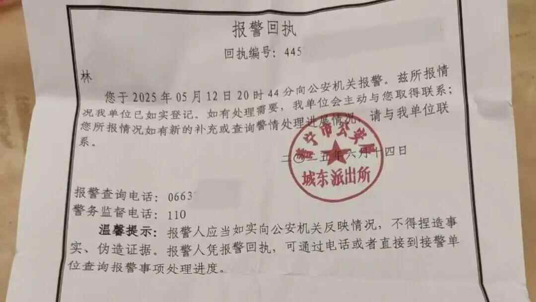 2025年5月12日,林女士向普宁市公安局城东派出所报案后,警方出具了一份报警回执单。