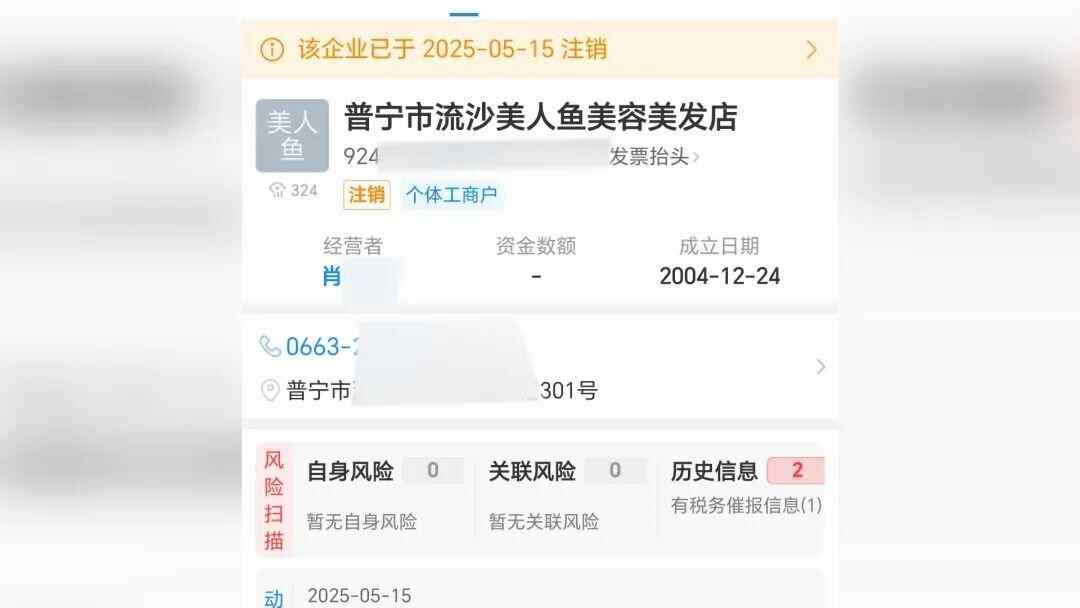 2025年9月4日,记者通过企查查查询发现,该店注册名为“普宁市流沙美人鱼美容美发店”,已于5月15日注销。记者拨打其登记电话,无人接听。