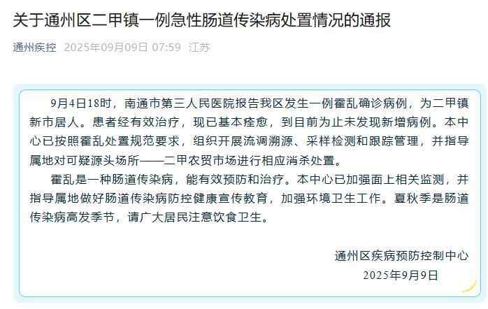 2025年9月9日,江苏南通通州区疾病预防控制中心发布通报: