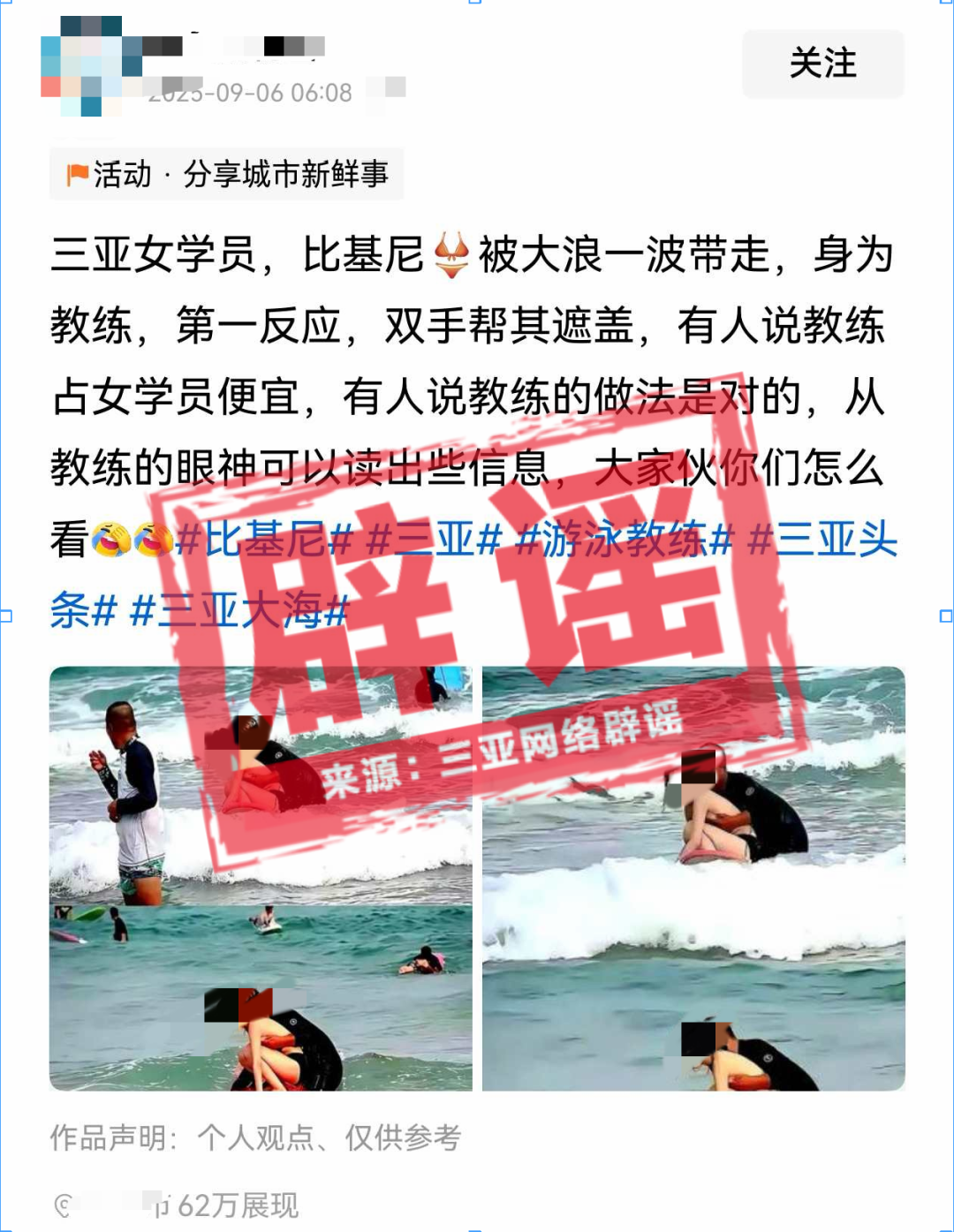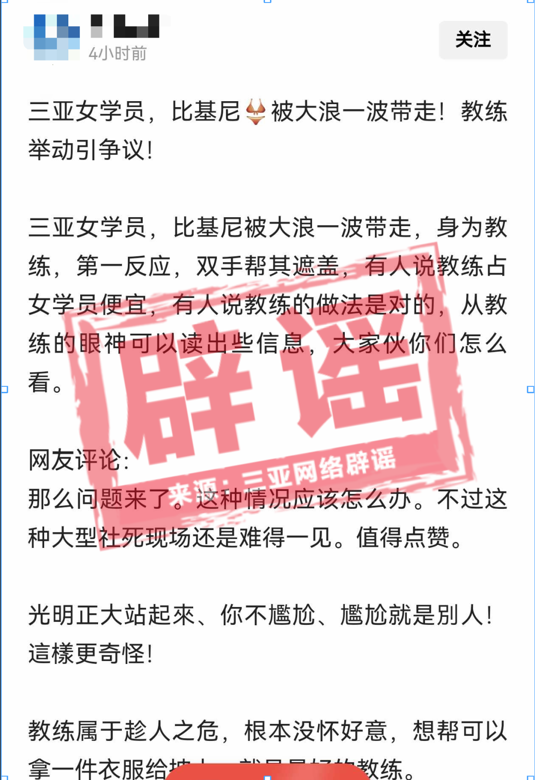 近日,有网民在网络平台发帖称“三亚一女学员比基尼被浪冲走,教练帮忙遮盖”,并配有多张图片及“#三亚#”等地域标签,引发关注。