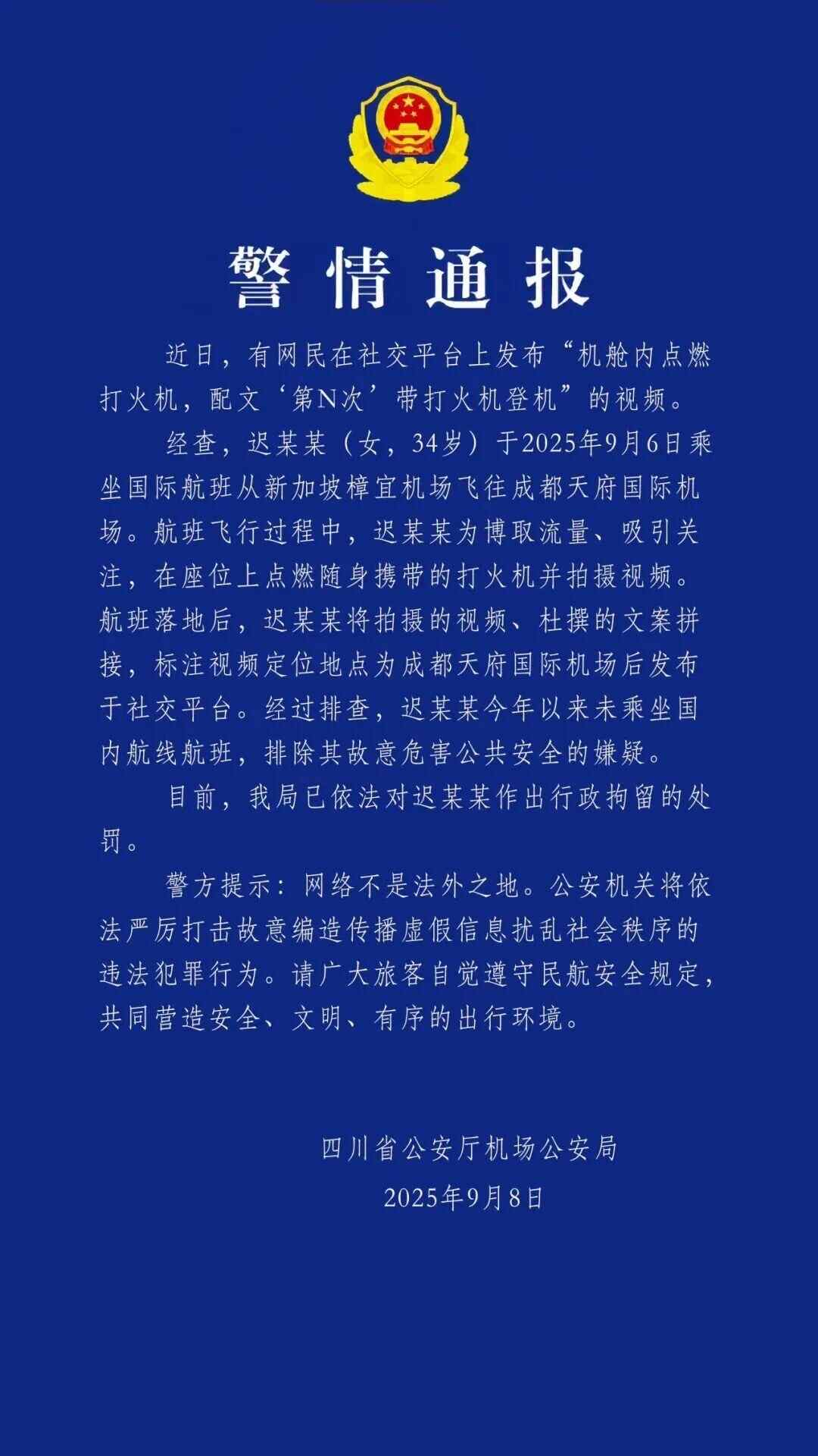 经查,迟某某(女,34岁)于2025年9月6日乘坐国际航班从新加坡樟宜机场飞往成都天府国际机场。航班飞行过程中,迟某某为博取流量、吸引关注,在座位上点燃随身携带的打火机并拍摄视频。航班落地后,迟某某将拍摄的视频、杜撰的文案拼接,标注视频定位地点为成都天府国际机场后发布于社交平台。