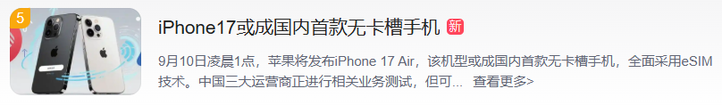 但今年形势或许会发生较大转变。根据已经透露的消息,iPhone 17系列将引入一款全新的iPhone 17 Air机型,主打极致轻薄,知名苹果分析师郭明錤猜测的厚度是5.5mm,而这个厚度,被认为无论如何是无法容纳实体卡槽的。这意味着,销售iPhone 17 Air的运营商将必须支持苹果eSIM。
