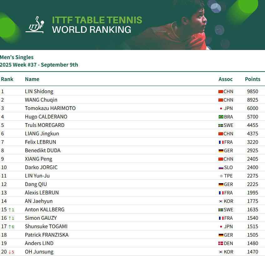 男单方面,林诗栋以9850分位列第一,王楚钦位居第二,梁靖崑排在第六,向鹏位列第九。
