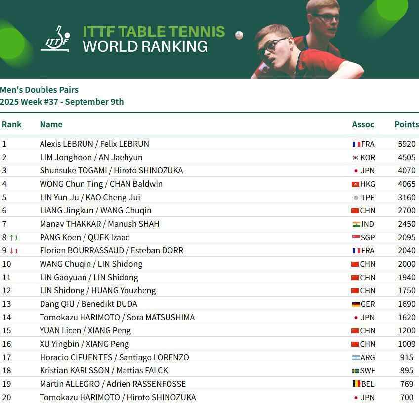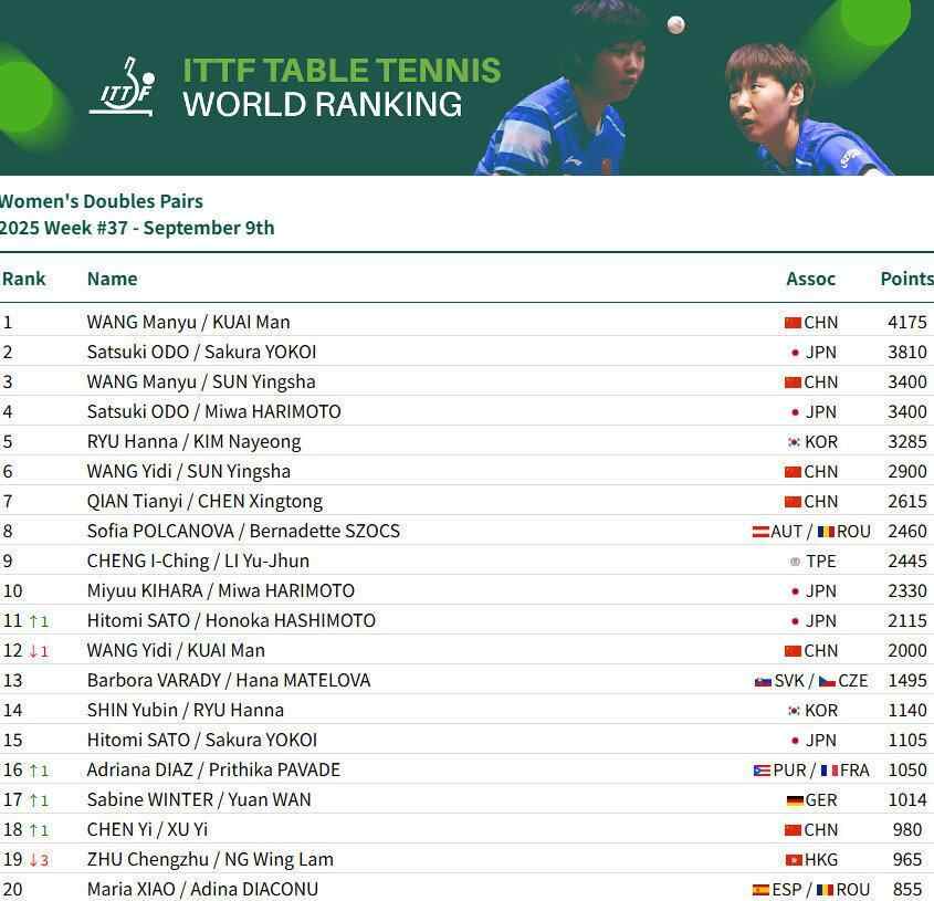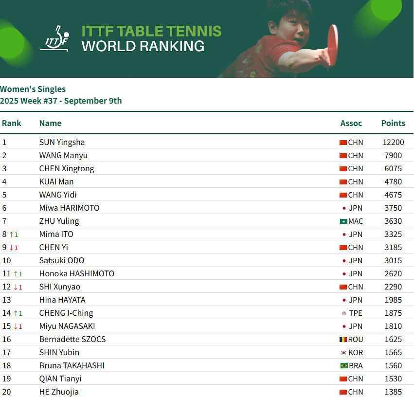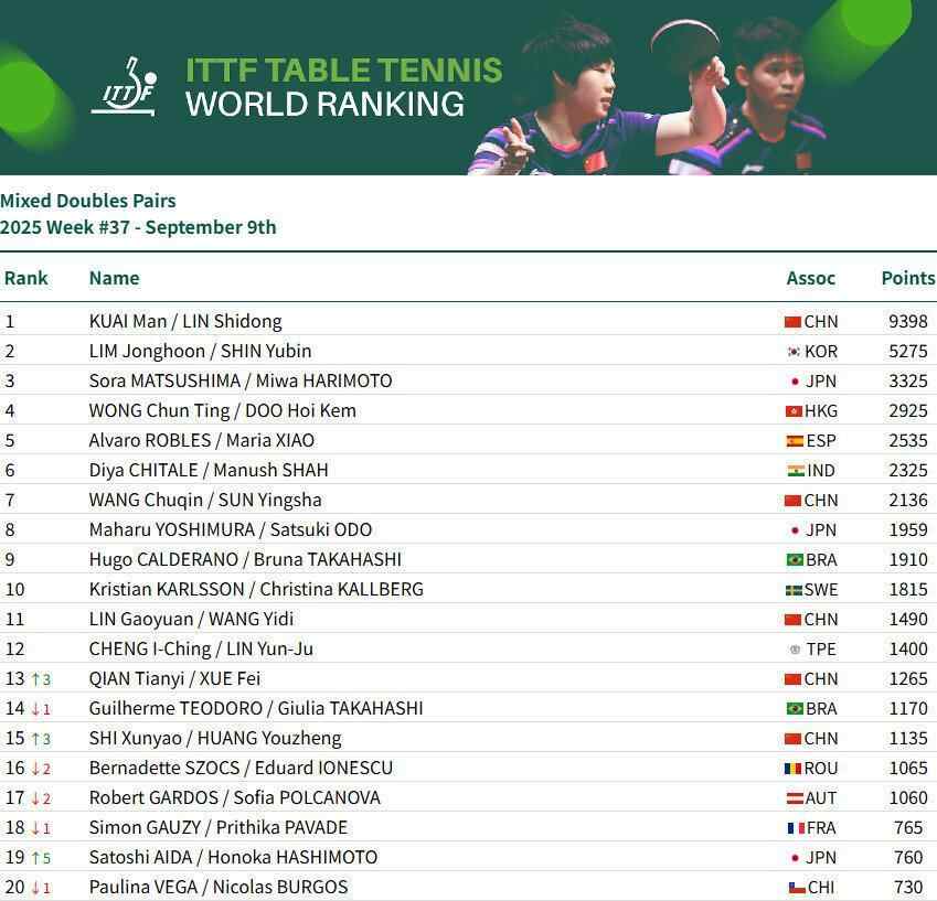 北京时间9月9日,国际乒联公布了2025年第37周的最新排名,中国球员林诗栋和孙颖莎继续占据男单和女单世界第一的位置,其中孙颖莎连续165周占据榜首,王曼昱/蒯曼排名女双第一,蒯曼/林诗栋位居混双榜首。