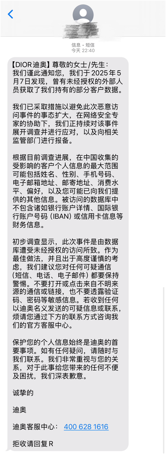 据此前报道,5月12日晚,多位网友在社交平台发帖称收到迪奥(Dior)的短信。迪奥表示,公司于2025年5月7日发现,曾有未经授权的外部人员获取了其持有的部分客户数据。