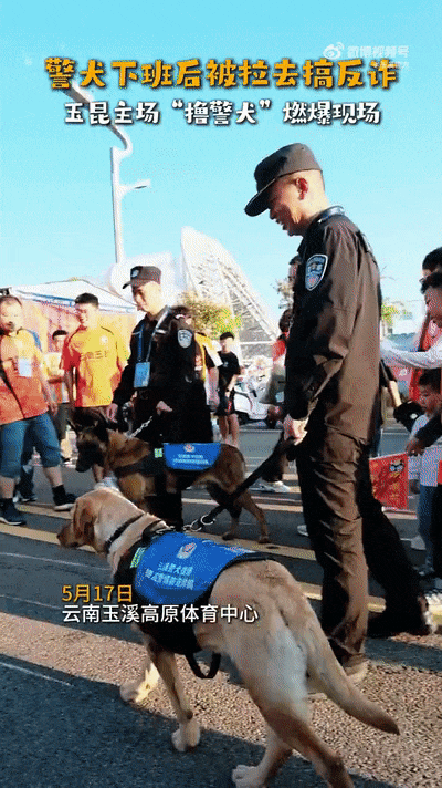 5月17日下午,云南玉溪,警犬“拉多”差点被围观群众“薅秃了”。“拉多”是玉溪市公安局警犬基地的明星警犬,刚刚荣获了全省血迹搜索的第二名。那天“拉多”下班后,被训导员拉去球场外参加反诈宣传,虽是“被迫营业”,但也十分专业,还和围观的人们合影互动。