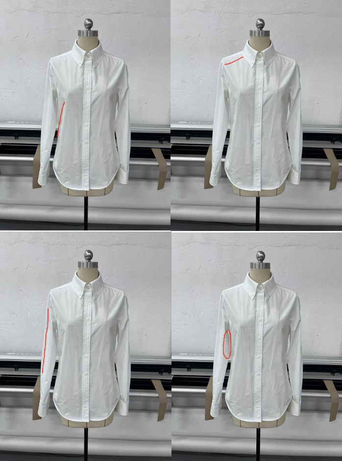 比起裤子,上衣制版更复杂。比如这件衬衫,胸下口有斜纹,说明版型胸省量不够,肩部拔量不够,肩缝又有堆余料,袖子外短里长,一堆问题。不过有些问题是工艺不到位,有些是面料问题,有可能熨烫一下就隐藏了。